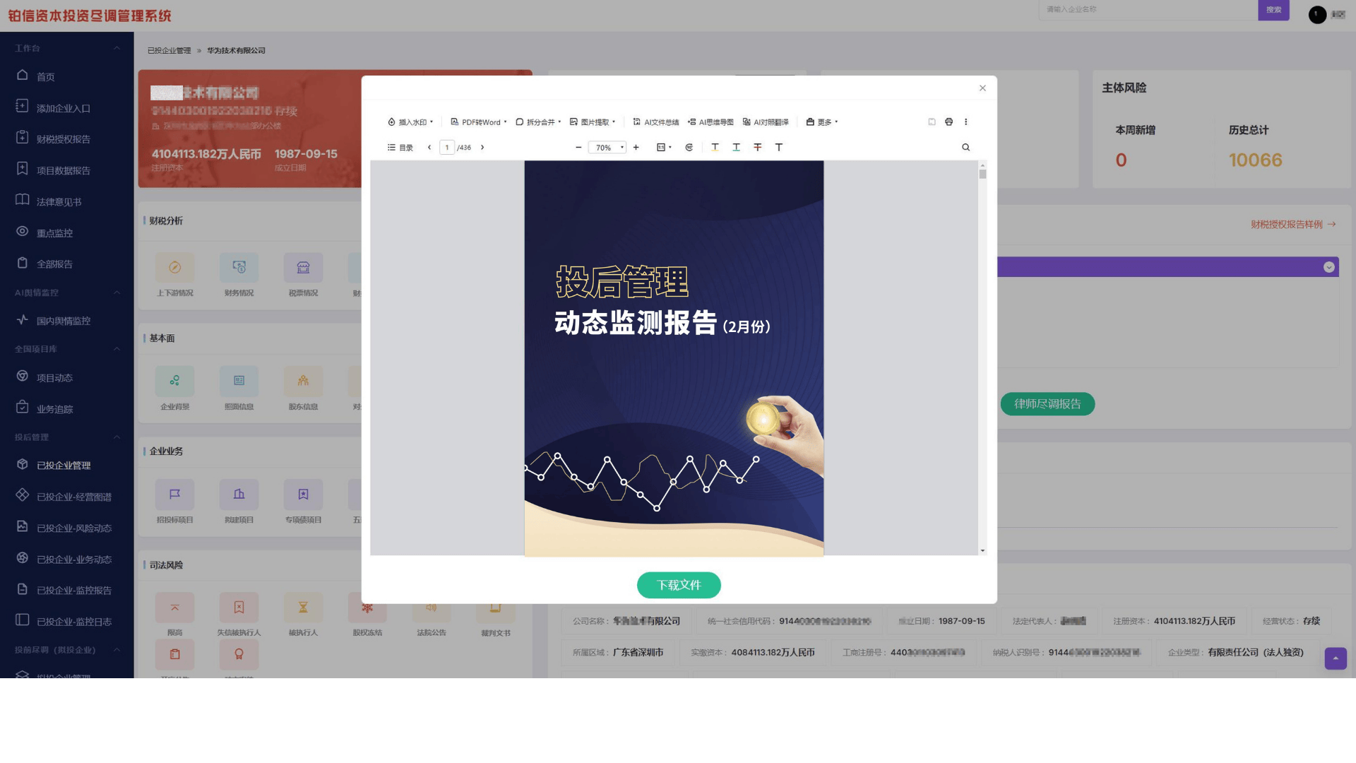 通过犀牛卫投后管理系统,金融机构人员能实时掌握已投企业的关键动态,为投后管理提供精准决策支持。具体而言,系统可助力金融机构获取已投企业本月的行政处罚信息,为机构人员构建合规风险预警机制。行政处罚往往意味着企业在税务、环保或市场监管等方面出现了违规行为,及时获取该信息,能够让机构人员在监管部门正式通报或企业信用恶化前主动介入。这不仅能让机构重新评估该笔资产的合规成本,更能依据协议条款启动保护机制,防止因企业罚款导致的现金流恶化,守住合规底线。